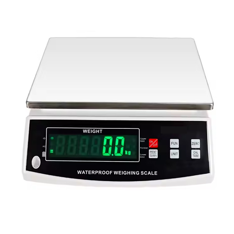 roduct name Scale Waterproof Material high quality ABS Key words waterproof electronic scales Capacity 3kg/0.1g, 6kg/0.2g, 15kg/0.5g, 30kg/1g Color White Display LED / LCD Product Size 30*30*14.5 cm Warranty 2 Years Certification IECEE Application Seafood |